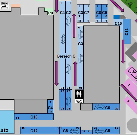 Bereich B: laufende Meter oder Parkbuchten, Außenbereich.