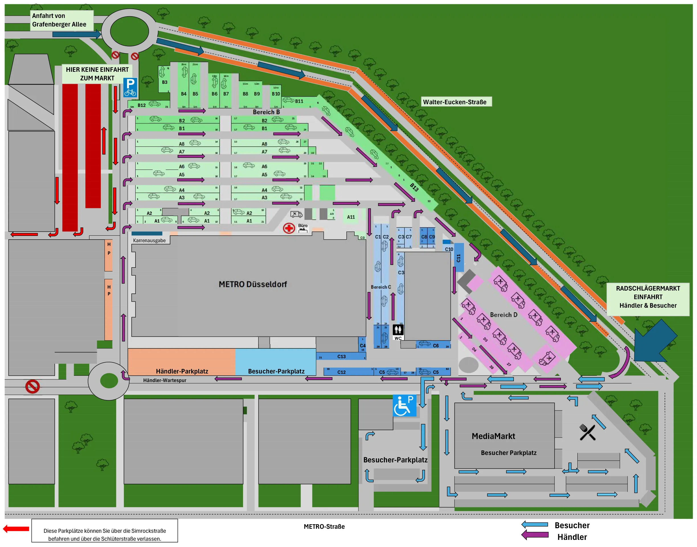 Hier ist der Geländeplan des Radschlägermarktes Düsseldorf auf dem Gelände der METRO an der Schlueterstraße/Einfahrt Walter-Eucken-Str. hinter dem MediaMarkt, 40235 Düsseldorf.